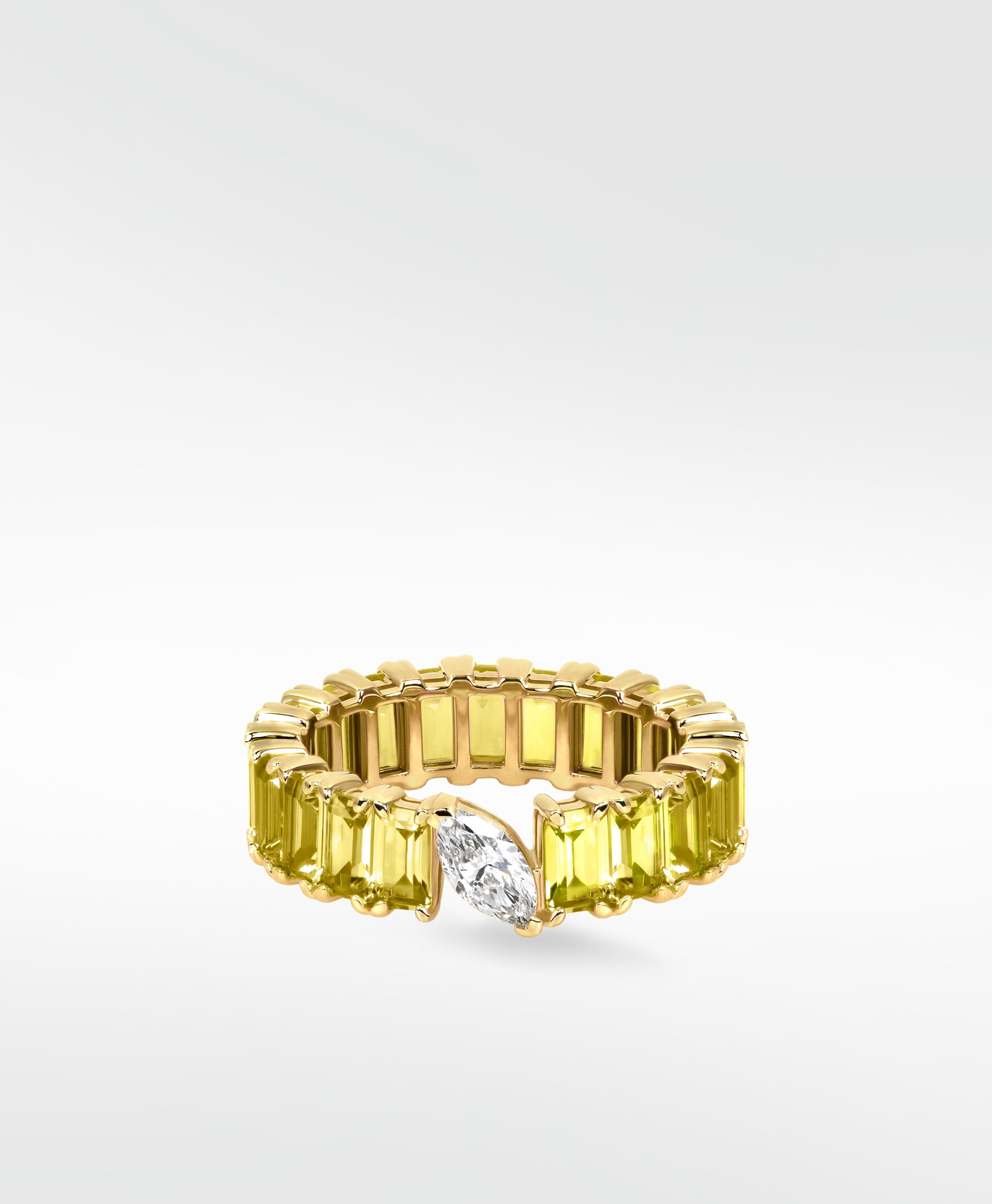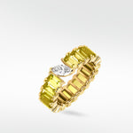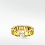 This exquisite tennis ring is designed to captivate a portrait set yellow sapphire in fancy emerald cut. Enhancing its modern allure, a striking offset marquise-cut lab-grown diamond disrupts tradition, transforming it into a truly unique piece.