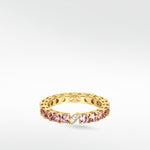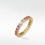 • Delicate pink sapphires encircle this eternity band, crowned with a marquise-cut diamond accent—an effortlessly stackable piece with enduring beauty and charm.